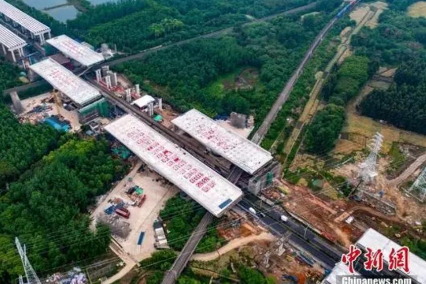 4月25日,四川成都,俯瞰成绵高速公路扩容项目4座桥梁顺利完成转体后的现场。当日,G5京昆高速公路成都至绵阳扩容项目总重7.6万吨的4座桥梁经66分钟紧张作业同步转体到位,安全跨越达州至成都北环联络线铁路、成都北环线铁路枢纽,为京昆高速公路成绵扩容项目后续施工奠定了坚实基础。(无人机照片)中新社记者 刘忠俊 摄
