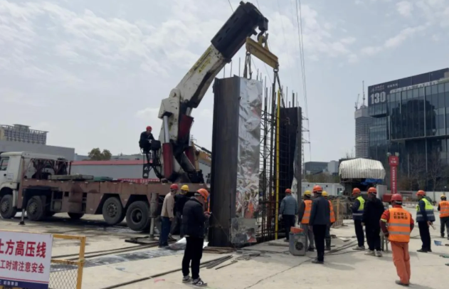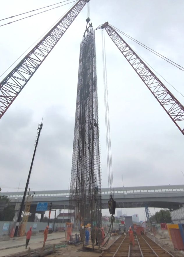 而位于上海市浦东新区金港路与金沪路交叉口西北侧的21号线一期金桥站,也是一个地下二层岛式车站,车站主体规模为218米*27.4米,基坑深度为18.35米。本次实施的金桥站北端头井11幅地墙,位于110kv架空高压线投影面下方,有效施工净距仅为9.5米,而实际地下连续墙钢筋笼长达40米,施工难度大大增加。为此,建设集团第四分公司组织各参建单位精心策划,针对高压线下地墙施工使用极限净空下钢筋笼分节吊装方案。采用低净空成槽施工,将钢筋笼拆分成9节,利用120吨折臂吊车在超低净空下进行钢筋笼吊装,顺利完成了本次超低净空地墙施工任务,为后续主体结构回筑奠定基础。
