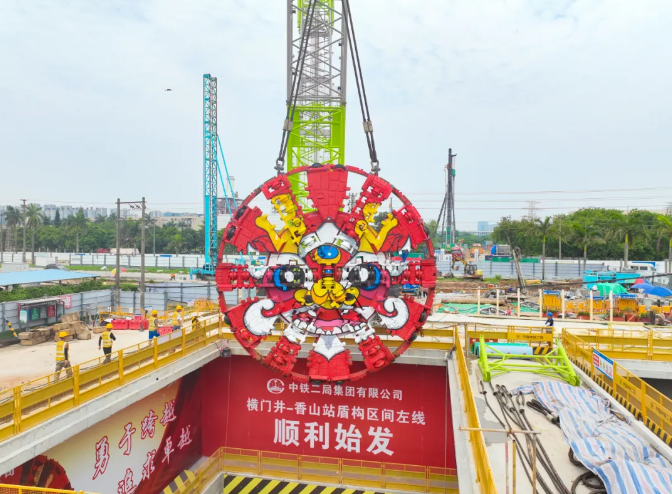 5月9日,南珠中城际(中山段)首台盾构机“香山一号” 刀盘在中铁二局城通公司南珠城际NZZ-2标施工现场顺利吊装下井。随着绘有“醒狮”图腾的盾构机刀盘在400t履带吊的精准配合下缓缓下落,准确运至预定安装位置,顺利完成刀盘和盾体组装,标志着该工程即将开启盾构始发的全新旅程。