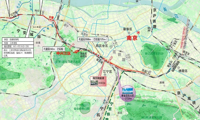 南京南隧道是宁芜铁路扩能改造工程全线控制性工程,跨越南京市秦淮区、雨花台区、江宁区,下穿宁安高铁、京沪高铁、沪蓉铁路等干线铁路和宁丹公路、牛首大道等交通要道,全长14.442公里,为单洞单线隧道,设计时速120公里。