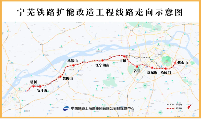 宁芜铁路以货运为主,兼顾少量客运,是提升长江经济带东段货运能力的重要基础设施、沿江铁路通道的重要组成部分。宁芜铁路扩能改造工程北起南京东编组站(不含),经南京市栖霞区、秦淮区、雨花台区、江宁区进入安徽省马鞍山市,过当涂县入芜湖市,终至芜湖东站(不含)。