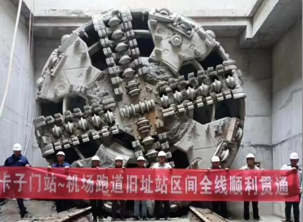 10号线二期卡子门站~机场跑道旧址站区间左线盾构机S1155的刀盘破壁而出,顺利实现卡子门站~机场跑道旧址站区间双线洞通。