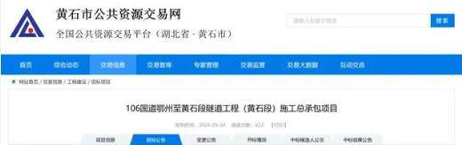 近日,黄石市公共资源交易网发布106国道鄂州至黄石段隧道工程(黄石段)施工总承包项目信息及招标公告。