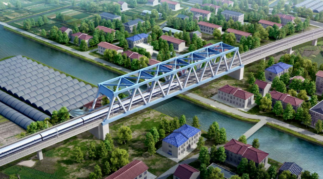 15标建设内容包括张家路港特大桥,动走1线、2线特大桥和动走双线特大桥。其中动走双线特大桥全长2013.2米,包括20孔32米简支梁、24孔24米简支梁、3座连续梁、1座钢桁梁桥。作为动双线特大桥的控制性工程之一,本次施工的钢桁梁桥为全钢结构,采取构件厂内加工、现场吊装螺栓联结成型施工工艺。桥梁横跨北横河,跨度为114米,总重量达2400吨。
