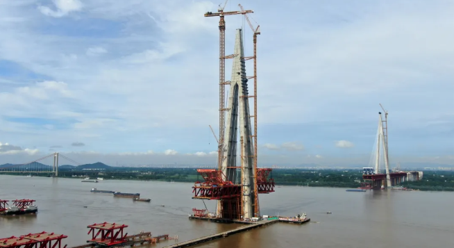 日前,由中铁大桥局承建的马鞍山长江公铁大桥4号墩开始双悬臂架设钢梁,并挂设斜拉索,一条红色钢铁“巨龙”正向皖江两岸“展翅欲飞”。