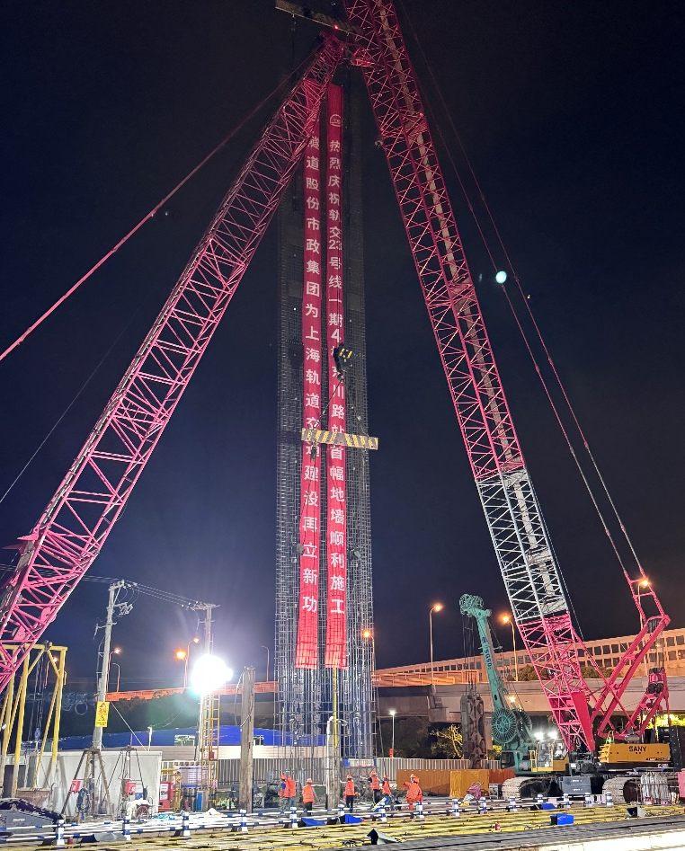近日,轨道交通23号线一期工程土建4标东川路站首幅地下连续墙开始施工。施工现场,长约41.45米,重约38吨的钢筋笼,在200吨主吊和150吨副吊机的相互配合下缓缓升起,并顺利入槽,标志着东川路站全面进入主体围护结构施工阶段。