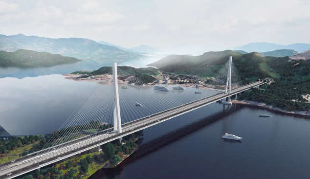 作为甬舟铁路的关键性工程之一,桃夭门公铁两用大桥全长约1531米,其中公铁合建段长1066米,连接册子岛和富翅岛。主桥采用主跨666米混合箱梁斜拉桥,是世界首座三箱分离式混合梁斜拉桥;公、铁采用平层布置,铁路为双线设计,布置在中间,设计时速250公里,公路为双向6车道高速公路,分幅布置在两侧,设计时速100公里,是世界目前最大跨度公铁两用混合梁斜拉桥;中跨主梁采用分离式钢箱梁,边跨主梁采用混凝土箱梁,梁宽66米,是世界目前最大宽度分离式混凝土箱梁。