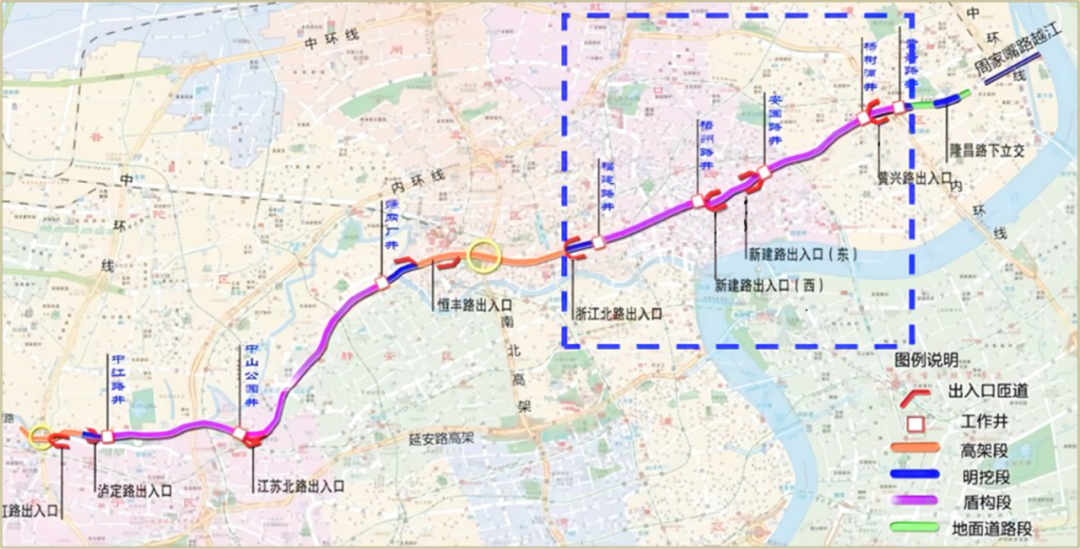 北横通道西起中环北虹路立交,东至周家嘴路内江路交叉口,全长约19.1公里。北横通道主线采用城市主干路设计标准,双向4车道+两侧应急车道或集散车道的建设规模,设计时速60公里,限高3米。