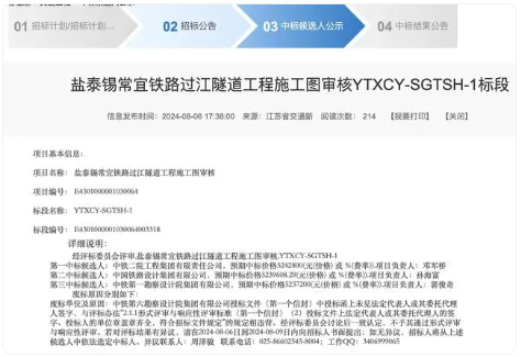 8月6日,《盐泰锡常宜铁路过江隧道工程施工图审核YTXCY-SGTSH-1标段》中标候选人公示,意味着盐泰锡常宜铁路,离开工又近一步。