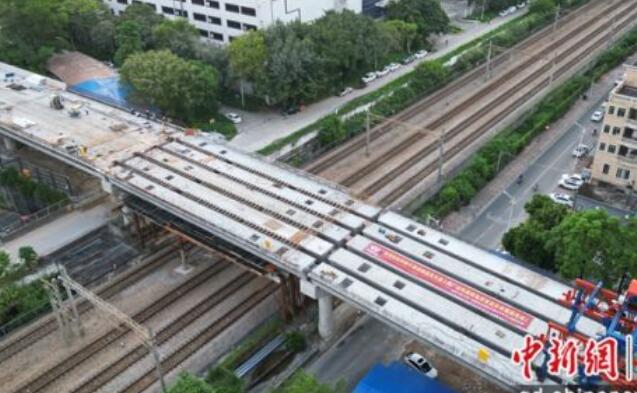 迎宾大道上跨广深铁路立交改造工程道路呈东西走向,是塘厦镇的主干道,承担连接广深铁路东西片区的城市交通枢纽功能。该工程于2023年7月3日正式封闭施工,内容包括拆除既有跨铁路桥,新建桥扩宽为双向4车道,跨越铁路后落地连接既有道路,新桥主跨梁长37.5米、宽16.5米。