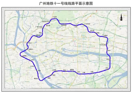 广州地铁十一号线是广州强化地铁线网整体性、缓解中心城区交通压力的环形骨架线路,全长约44.2公里,全部采用地下敷设方式,串联越秀、荔湾、海珠、天河、白云5个中心城区,全线共设置32座车站,换乘站26座,16座与既有线路换乘,被称为广州地铁的“换乘之王”,线路采用8A的8节A型编组车辆,最高运行速度80公里/小时,计划今年底开通试运营。