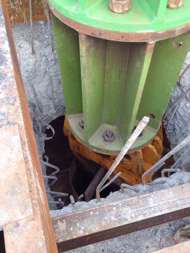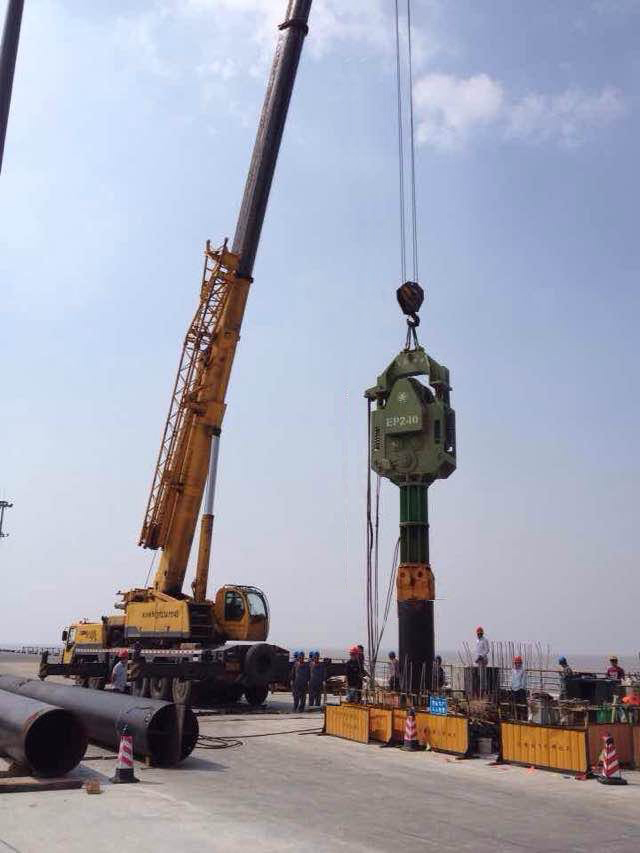 一般来说,振动锤打桩都会选用履带吊起吊进进行作业施工。因工期只有2天,履带吊进出场费较高,为了提高施工效率,节约成本,上海振中为用户提出采用汽车吊挂EP240偏心力矩可调电驱振动锤,因该设备机构的最大特点是利用液压控制偏心变换装置,可实现“零”起动、“零”停机及在运行过程中从零至设计最大值间任意无极调节偏心力矩,克服了启动和停机时产生的共振,故不会对汽车吊的伸缩臂及液压油缸造成损害,且在机器运行过程中方便自如地调节偏心力矩,以适应不同的土层的沉拔桩要求,从而达到理想的沉桩速度和效率。并根据工程情况,增加2米标准节,能够在狭小的桥面开口处将桩沉至桥面下面3米。采用此产品技术解决方案,因其良好的表现和零故障率,让用户感到十分满意,最终提前一天完美告捷。