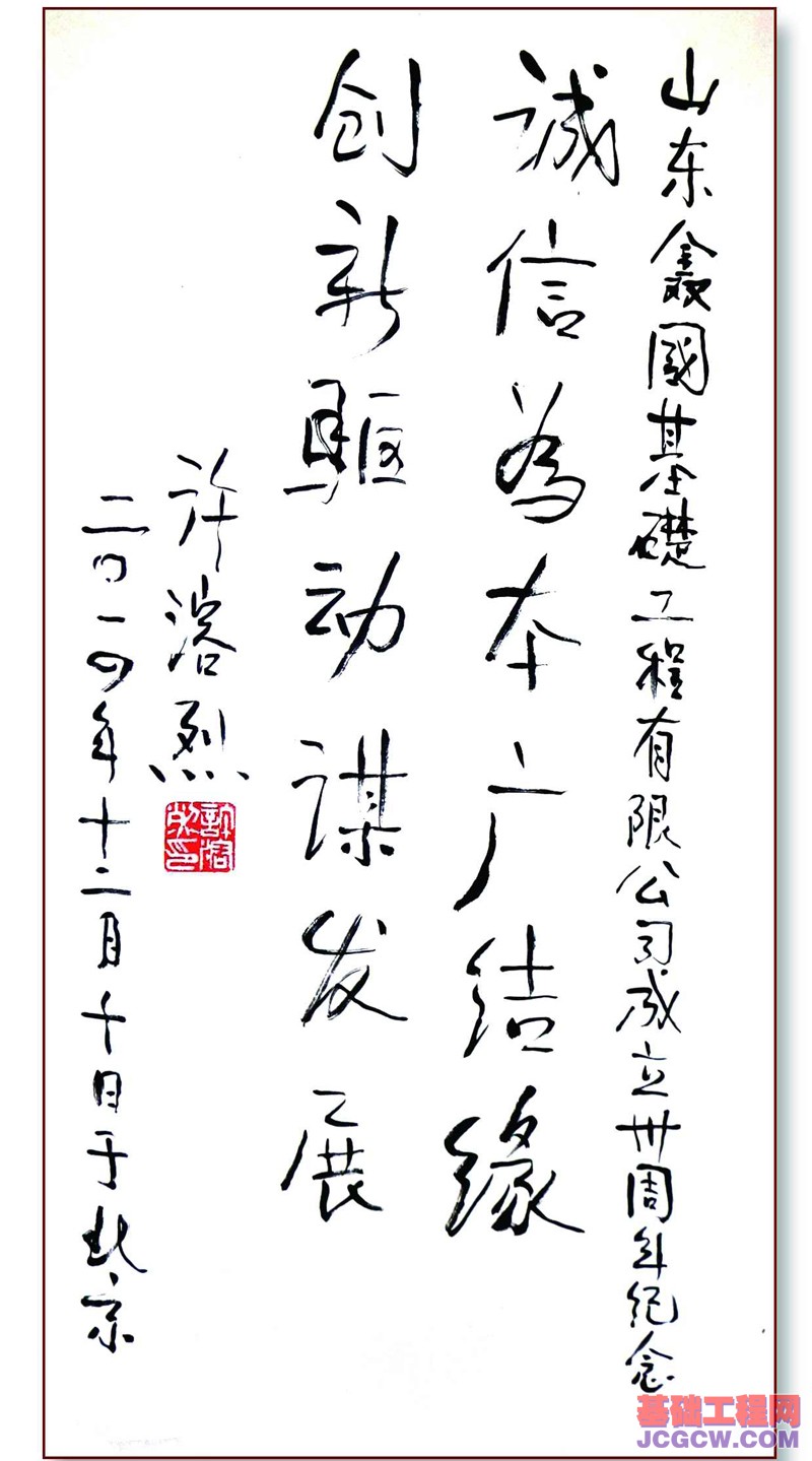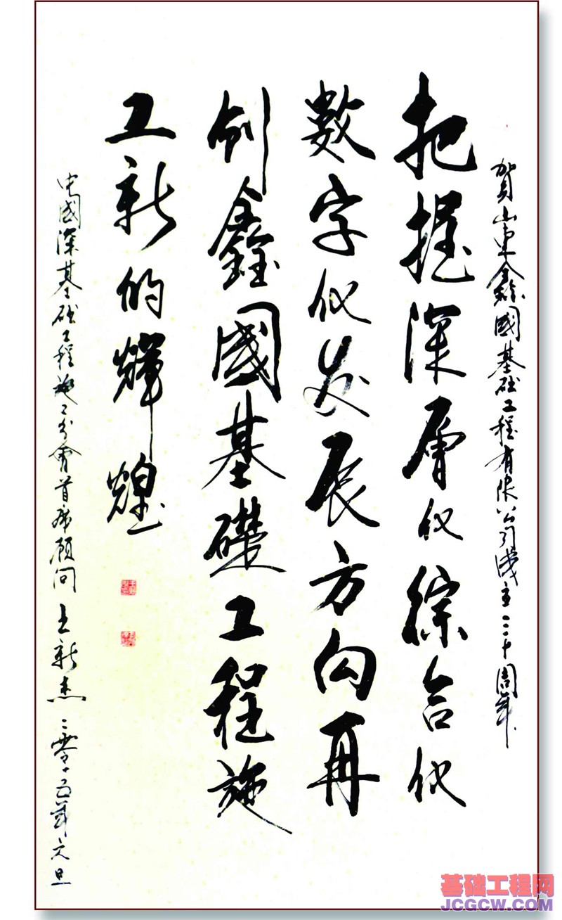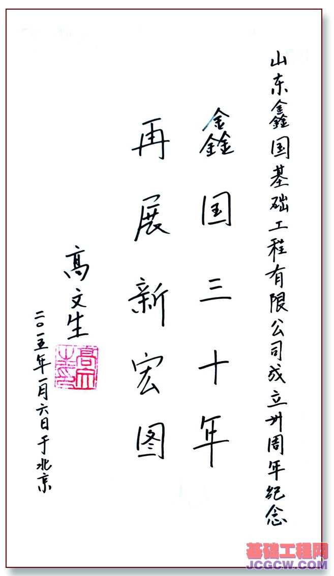 万物有灵靠根深,国域建设基有根;广厦路桥桩擎起,重质诚信鑫国人。鑫国基础的30年,就是一个从星火走向华彩的历程,昨天,鑫国人艰苦创业、风雨无阻;今天,鑫国人开拓进取、创新发展;明天,鑫国人心存高远、奋勇前行!在鑫国基础成立30周年之际,中国建筑业协会深基础施工分会理事长张晋勋祝贺题词:“情满客户,源自经营之旨;创新发展,秀于行业之林”,这是对鑫国基础30年辉煌历程非常精辟的概括与总结。