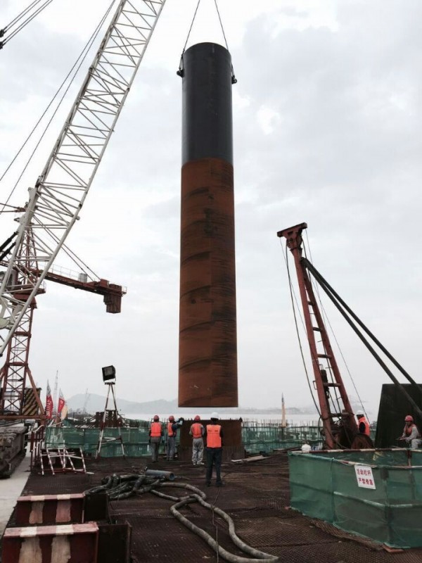 桩基础护筒最大直径3.3米,深度40米。振动锤吊起了巨大的桩基础护筒,让人叹为观止。振动锤施工进行的很安稳,施工效果也是很棒。