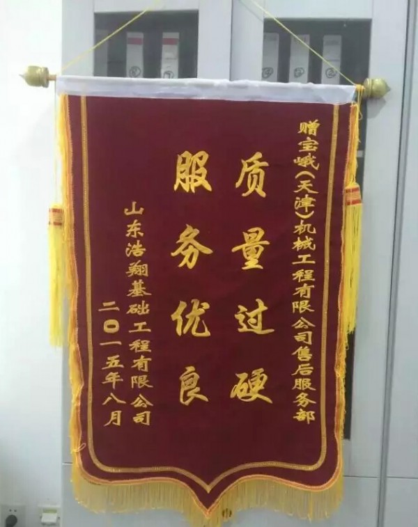 2015年8月,宝峨(天津)机械工程有限公司客户服务部广西办事处收到了南宁客户罗东森先生送来的“服务周到,待客热情”的锦旗。与此同时,宝峨天津客户服务中心也收到了来自山东浩翔基础工程有限公司的“质量过硬,服务优良”的锦旗。