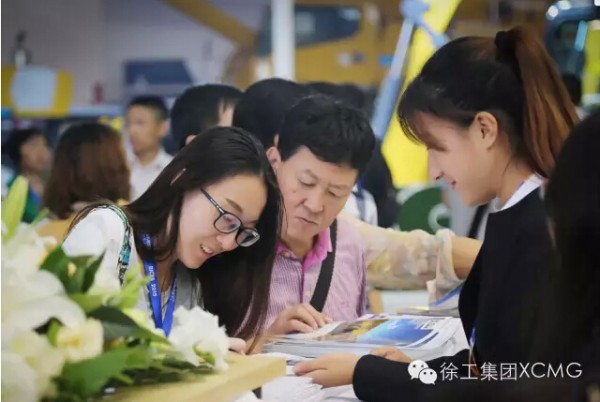 徐工展台前,客户领取心仪产品的资料
