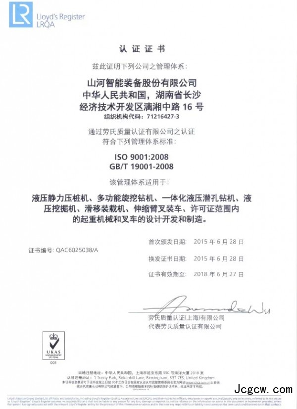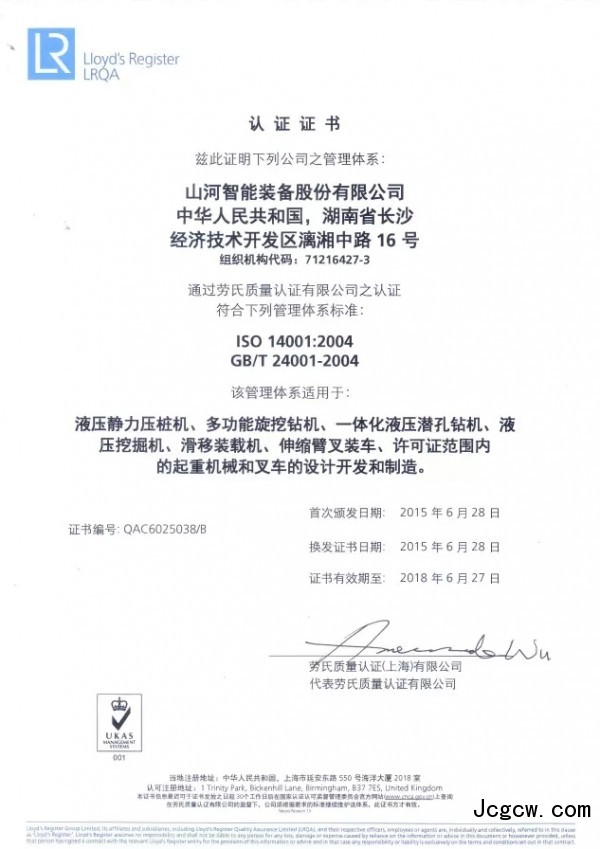 2015年,山河智能装备股份有限公司的质量管理体系、环境管理体系、职业健康安全保证体系证书到期。公司领导为了提升公司的管理水平,决定更换本次换证审核的认证公司,由国内品牌中国质量认证中心(CQC)更换成国际知名品牌英国劳氏质量认证有限公司(LRQA)。