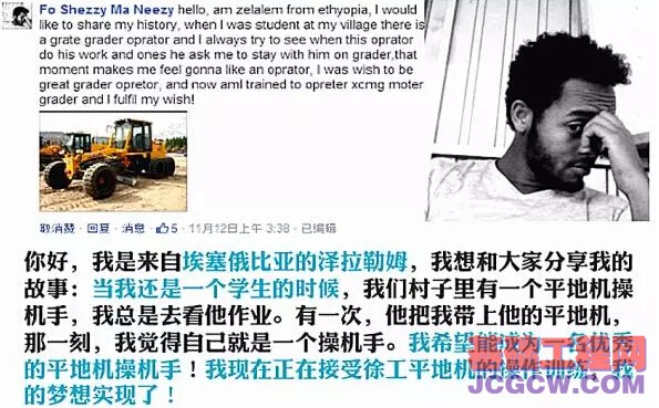徐工在海外也拥有了一群肤色各异的洋粉丝(图为埃塞俄比亚粉丝通过Facebook讲述他与徐工的故事)