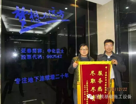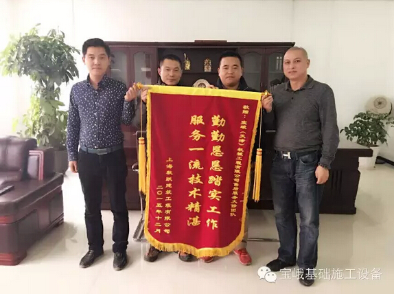 上海远方基础工程有限公司设备事业部负责人栗宗平先生赠送给双轮铣团队“服务热情尽职尽责”的锦旗。