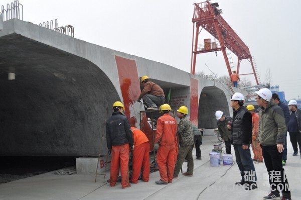 在连镇铁路项目部书记朱金涛、广陵制梁场总工杨宏旭陪同下,大家先后参观了制梁场存梁区、钢筋加工区、箱梁制梁区、拌合站等处。梁场总工杨宏旭详细介绍了制梁场流程布置、生产控制情况、管理增效节能、安全质量严控等,参观人员不时拍照和交流。