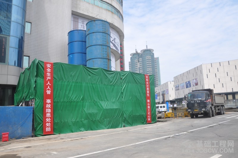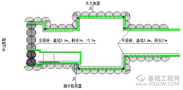 其围护结构采用硬咬合灌注桩结合一道钢砼支撑及四道Φ609钢支撑,紧邻东方商厦、新华联商厦及地铁车站50m范围内在硬咬合灌注桩外侧设置MJS工法桩作隔离墙,以减小咬合桩施工期间对周边环境的影响。东侧新华联商厦距离MJS工法桩最近约5m,西侧东方商厦边缘距离MJS工法桩边缘仅3m;MJS施工区域有临改电信、自来水、电力等众多管线,与MJS工法桩最近距离约为0.5m。