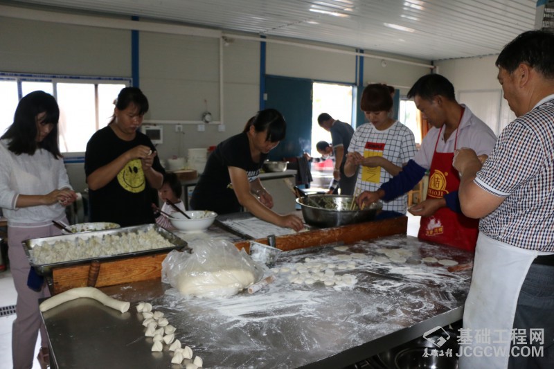 看到职工们除了在办公室忙碌,还要经常跑工地,每天都是一身泥土一身汗水,来工地探亲的家属们非常心疼。于是她们主动提出要为改善项目部职工生活出点力,就自发地组织起来,要为职工们做“亲情饺子”。她们主动到职工食堂帮厨:和面、摘菜、剁馅、擀皮,包饺子。这些大多来自北方的家属们,包起饺子来个个都是“顶尖高手”。四、五个家属,只要三个多小时,就能轻松搞定四、五十个职工吃的饺子。