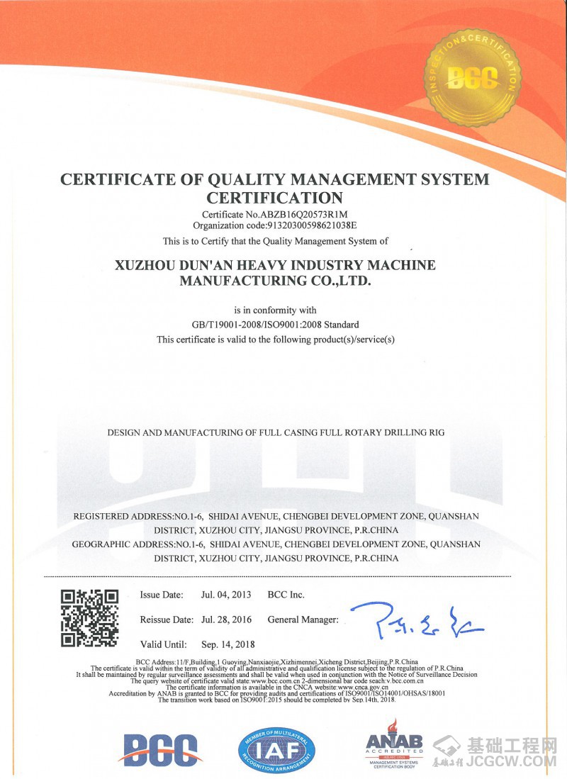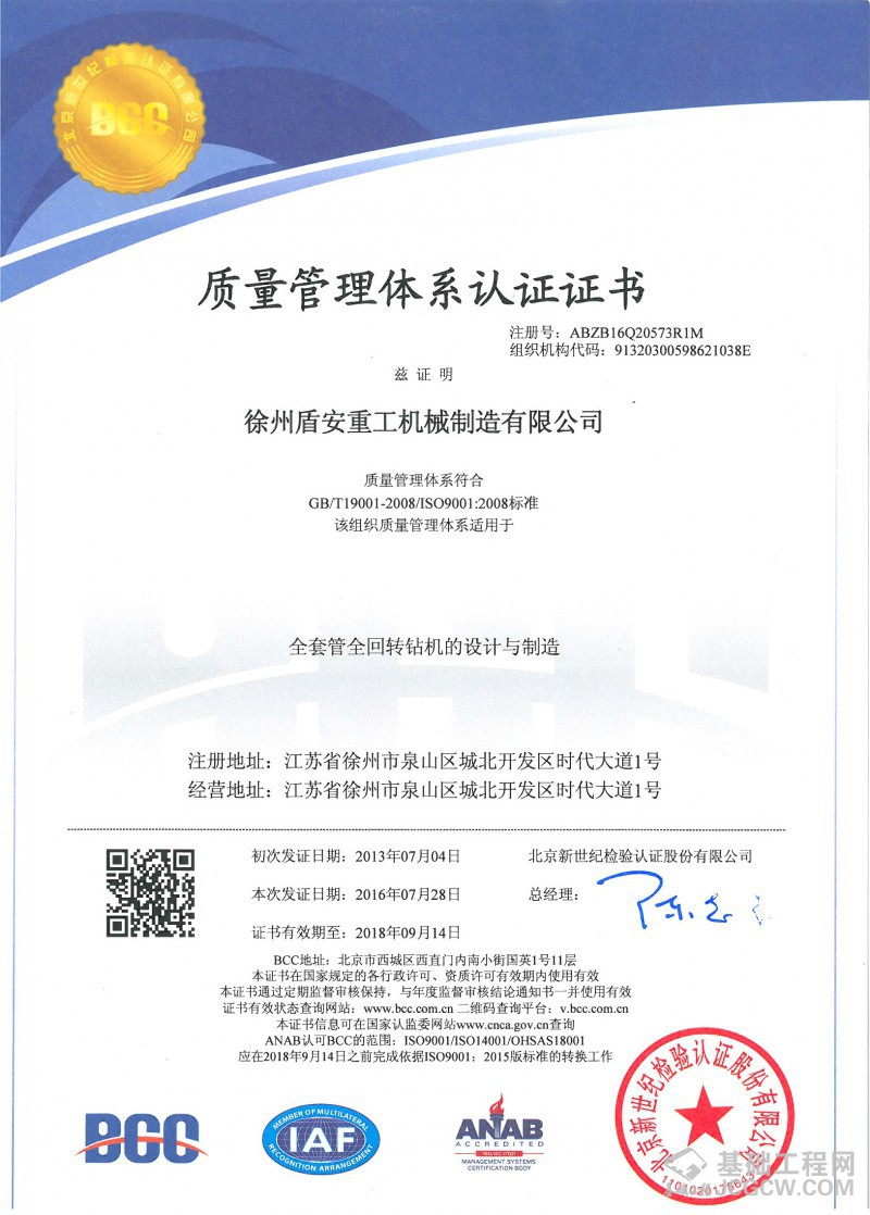 经过第三方权威认证机构全面、严格、细致的审核,确认徐州盾安重工机械制造有限公司质量体系符合GB/T19001-2008/ISO9001:2008质量体系标准的要求,运行有效,同意通过审核,换发GB/T19001-2008/ISO9001:2008质量管理体系认证证书。