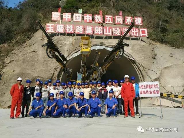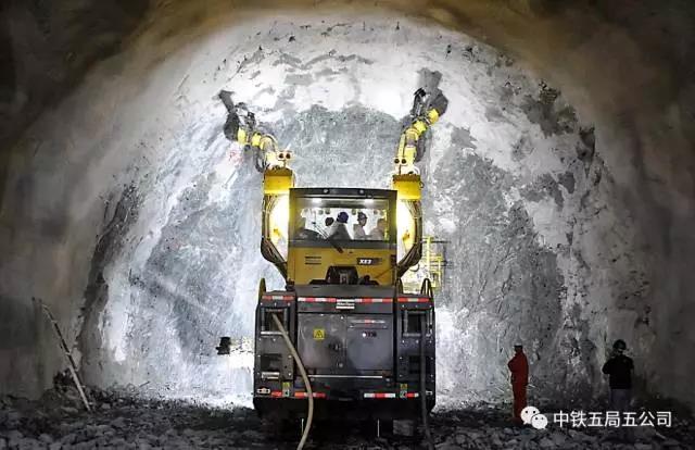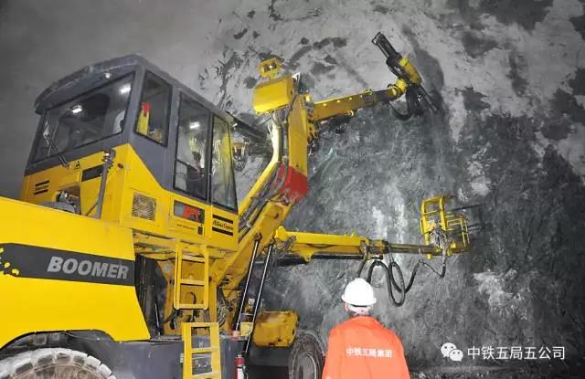 在中铁五局玉磨铁路项目部四工区,一台阿特拉斯·科普柯三臂凿岩台车从安定隧道进口驶入莫郎山隧道出口掌子面,开始快速的掘进作业,3名操作人员3个小时就可以完成全断面3.5m的钻孔工作,而传统的手持风钻则需12人在4小时左右才能完成同样的工作。
