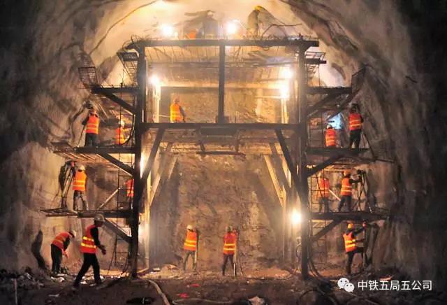 沪昆第一长隧壁板隧道全断面人工开挖时的场景