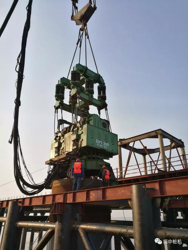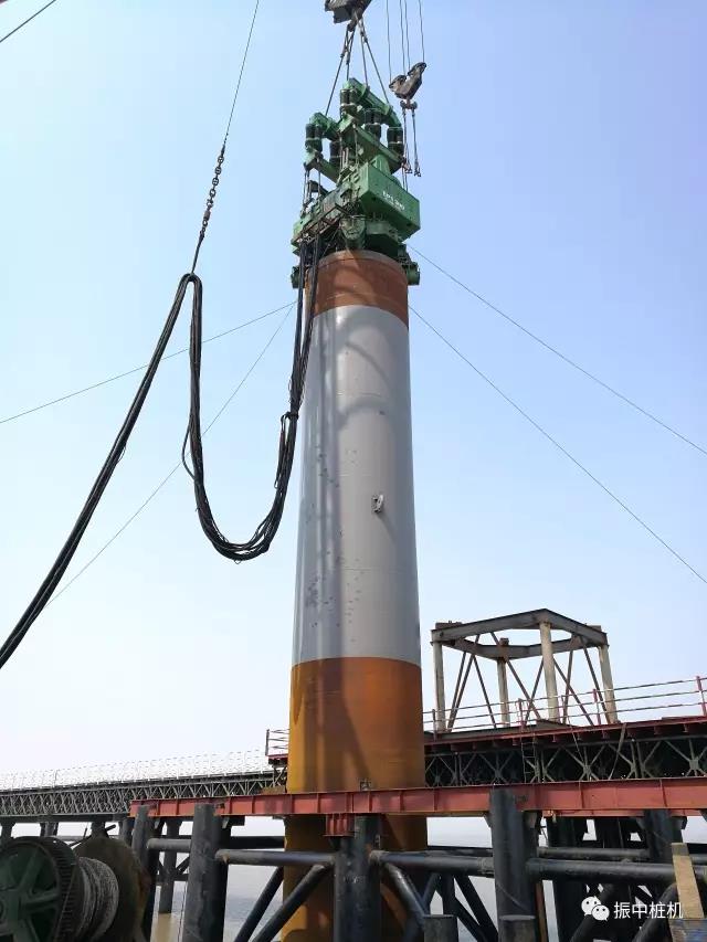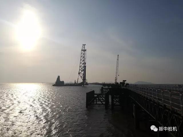 本次大桥建设中,上海振中机械制造有限公司数台大小功率不一免共振振动锤参与了栈桥搭设及桥墩基础钢护筒(直径3.9m 总长40m 总重140t)插打工作,其中全球最大EP1300免共振振动锤特受指挥部、项目部领导关注。并赞扬振中桩机制造水平高、产品质量过硬。