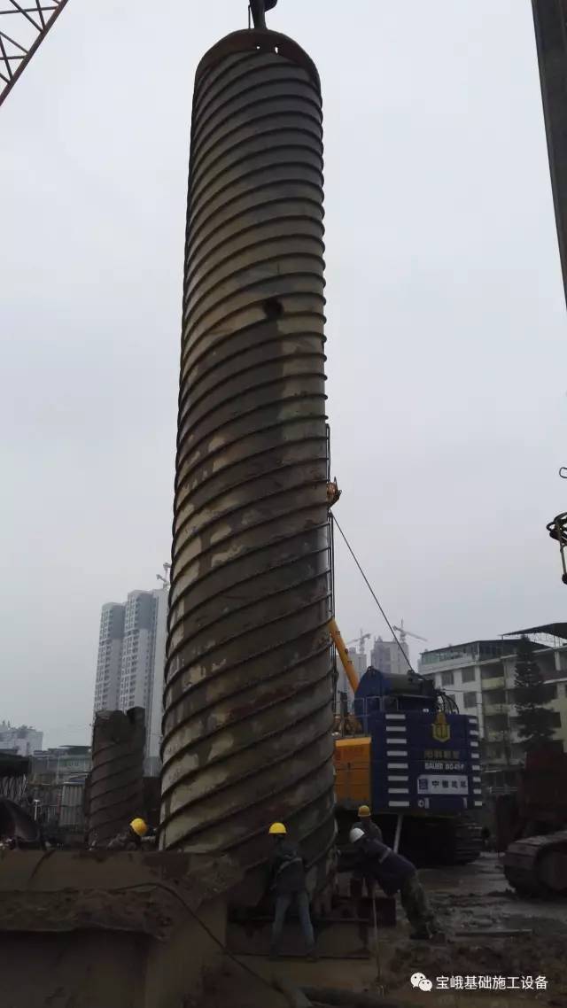 针对这种在国内乃至国际上都堪称“超高难度”的地质条件,旭腾桩基的技术团队,结合其30年的钻孔灌注桩施工经验,研发出一套旋挖钻机钻孔跟进全护筒的施工工艺,并设计了30多个不同直径的钻头(据旭腾公司介绍其中多款钻头申请了国家专利),其中包括15米超长、大直径牙轮筒式钻头(见下图),为“串”状溶洞施工提供了可靠的保障。