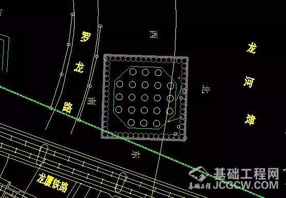 上图中间为主塔承台位置,共设置五排计21根桩基(桩直径2.5m)。承台北侧已部分侵入龙津河,东侧邻近龙厦高铁线,南侧侵占部分罗龙路,西侧紧挨商铺。施工空间极其狭小,还必须保证铁路安全(离铁路最近处仅15m),不能影响南侧道路的通行,还肩负龙津河的环保重任,也就是说除了主体结构空间之外,周围只有极少空间可用来施工。