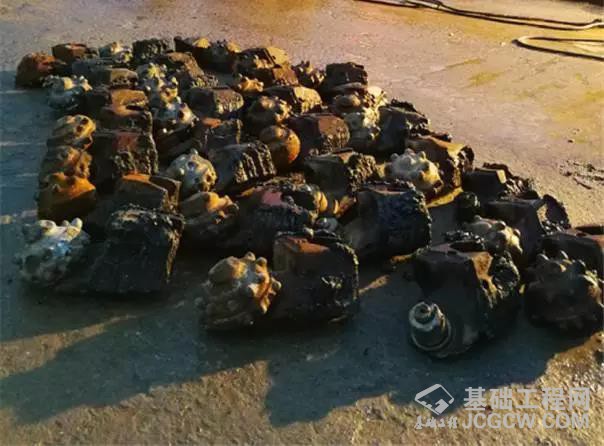 由于需要下放不同直径的护桶和处理不同岩质需求,项目部准备了三十多种钻头,有不同直径的钻头,有不同作用的钻头(如取芯钻头,全断面钻头,捞渣钻头,导正钻头等等)。