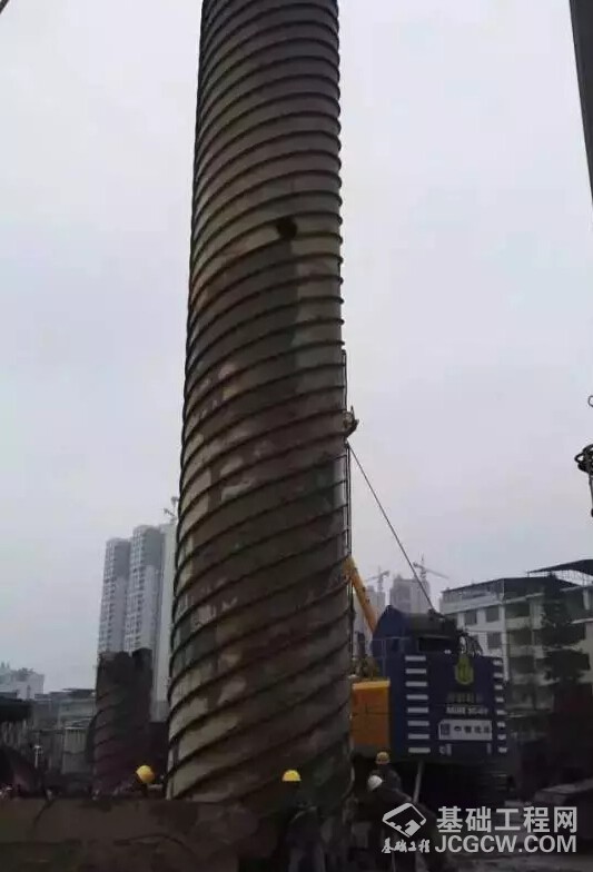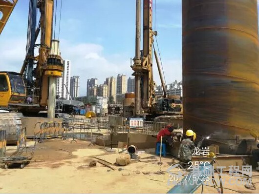 考虑到地下溶洞极其发育,我们采用全护桶跟进方式进行施工,护桶最多时候为6层,分别为(直径)3.6m,3.3m,3.05m,2.86m,2.65m,2.42m。