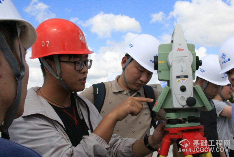 来访人员在项目部测量部副部长韦冬的教授下简单了解全站仪的使用