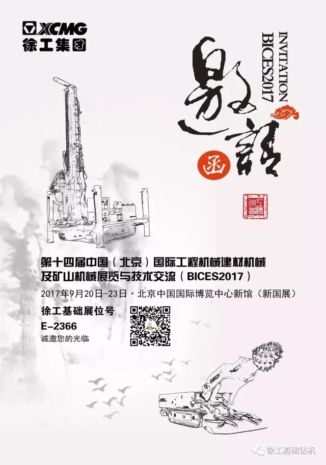 BICES 2017第十四届中国(北京)国际工程机械、建材机械及矿山机械展览与技术交流会,将于2017年9月20—23日在中国国际展览中心新馆(北京新国展)举行。徐工基础将携XTR6/260隧道掘进机、XSL5/260水井钻机亮相展会。