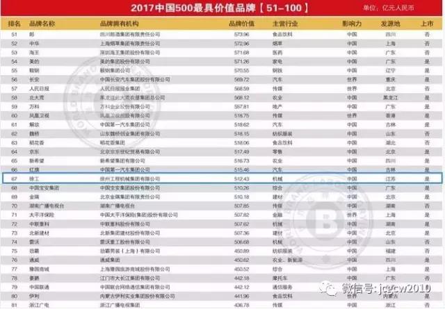 2017年6月22日,第十四届世界品牌大会暨第14届中国500最具价值品牌发布会在北京举办。世界品牌实验室(World Brand Lab)发布了2017《中国500最具价值品牌》排行榜,徐工以512.43亿元排名67位再次领跑中国工程机械行业,较2016年(430.81亿元)提升81.62亿元,增幅18.9%,这是徐工进入榜单以来连续第四年蝉联行业榜首。