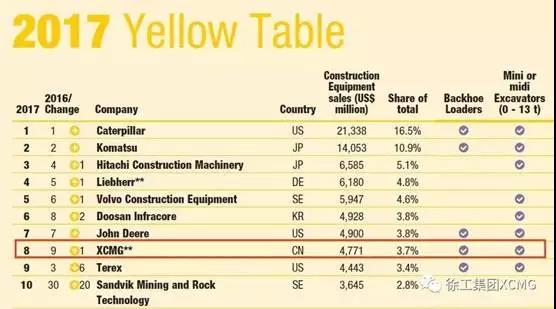 在2017年英国KHL世界权威全球工程机械行业排名中,徐工位列全球第8位,是唯一进入前10的中国工程机械企业。