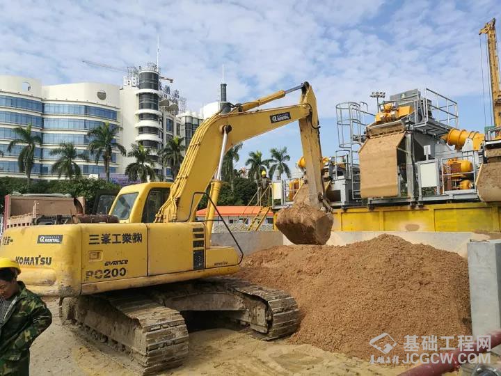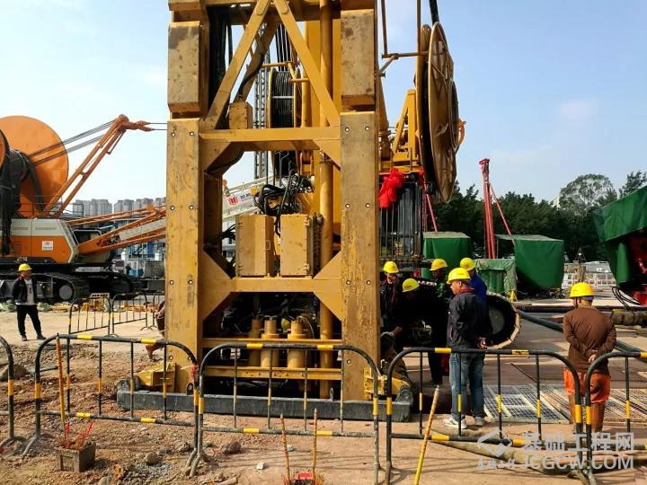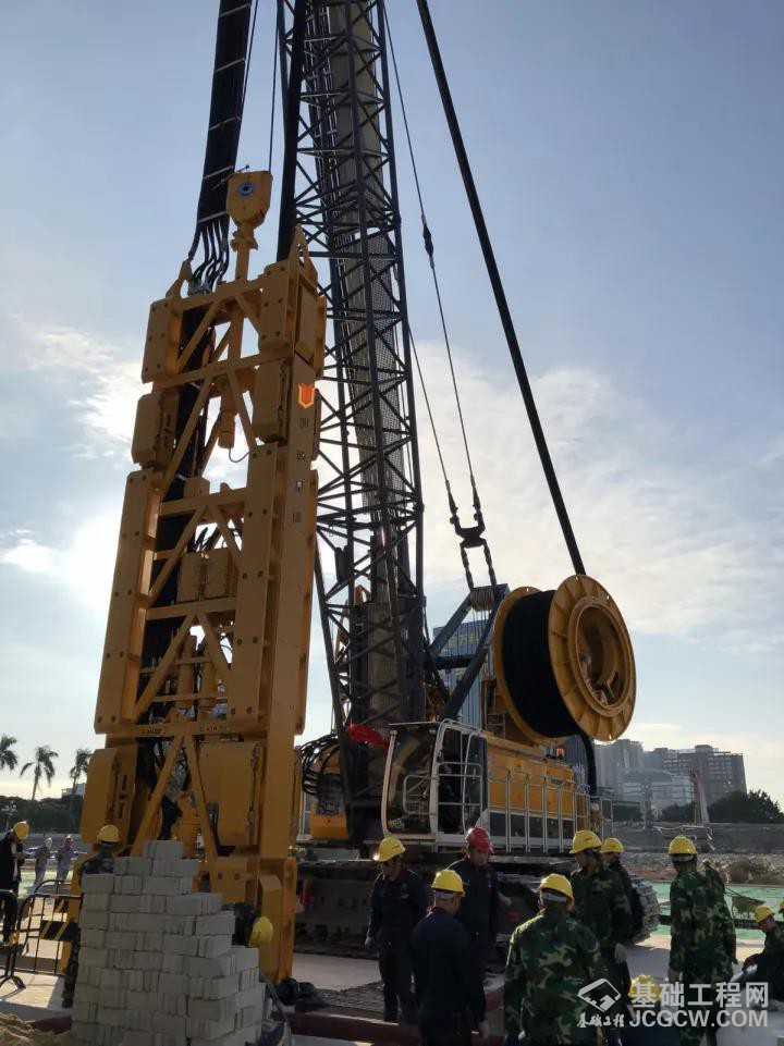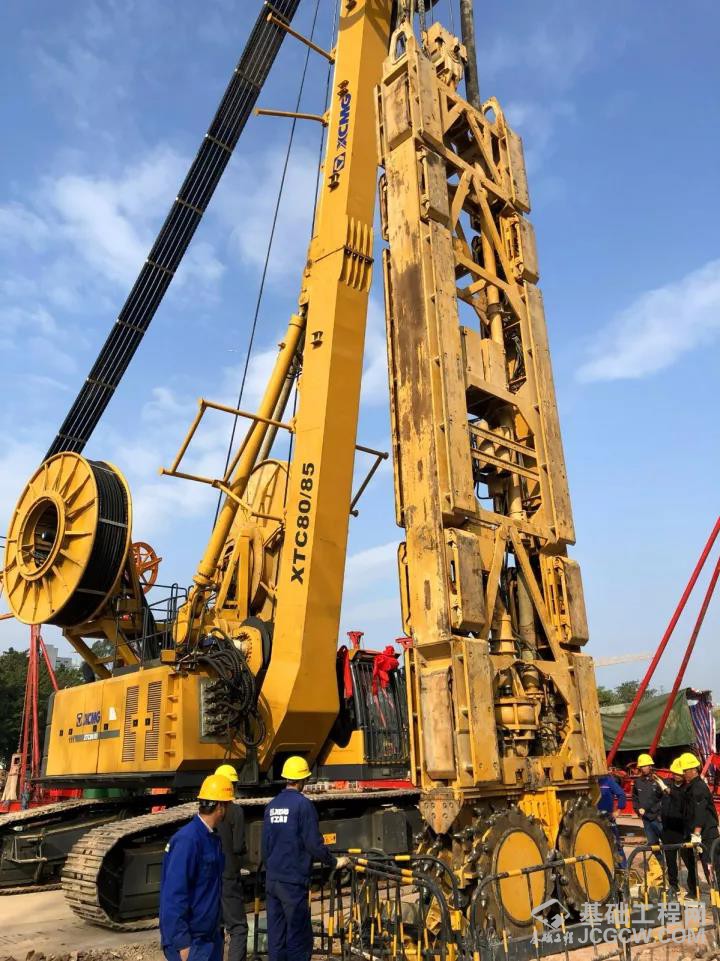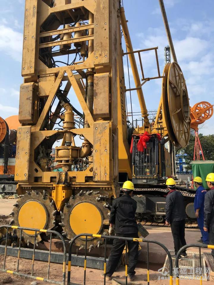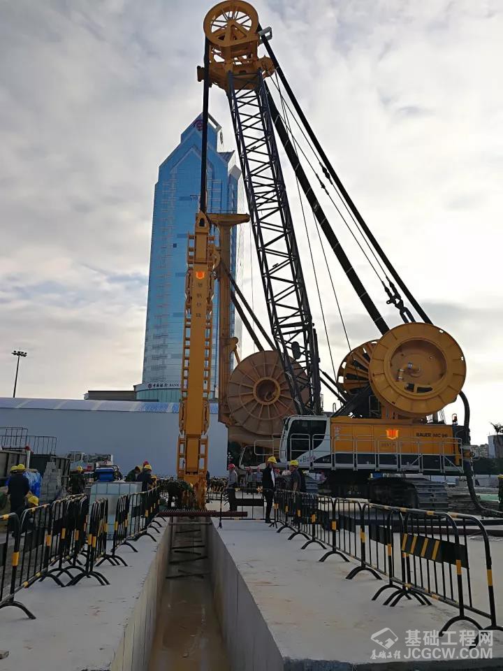 施工工艺:首先由MC96•BC40双轮铣铣削至深度25m,再采用徐工XR550D旋挖钻机两侧引孔至深度44m,最后由MC96•BC40双轮铣铣削成槽。