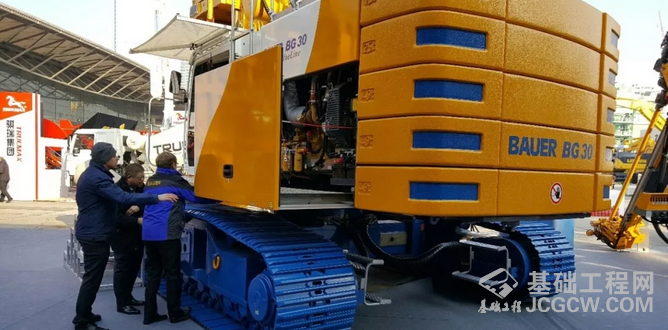 宝峨BG 30旋挖钻机(BT 80主机),配置280千瓦卡特彼勒发动机和单绳有效拉力265千牛的单层主卷扬机,动力头扭矩30吨米,最大钻孔直径2.5米,使用3节钻杆时最大钻孔深度可达54米,4节钻杆时最大钻孔深度达70米以上,5节摩擦钻杆时最大深度达77米。采用宝峨专利的抽拉式综合服务平台,使得维修人员在更安全的环境下对设备进行检修、保养。采用节能设计,油耗大大降低。创新的设计及安全理念获得2016年VDBUM 和Euro Test两项大奖。增加了钻进辅助系统,可实现自动加压、单双向自动卸土、套管起拔等功能,可以满足高负荷长时间运转,故障率低,嵌岩效率高、损耗小。
