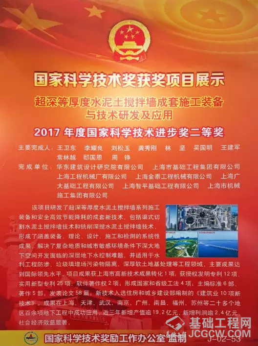 1月8日,2017年国家科学技术奖励大会在北京人民大会堂隆重举行。由华东建筑设计院、上海基础工程集团、上海工程机械厂、上海金泰工程机械有限公司、上海广大基础工程有限公司、上海智平基础工程有限公司、上海机施集团等七家单位共同完成的《超深等厚度水泥土搅拌墙成套施工装备与技术研发及应用》项目荣获2017年国家科技进步二等奖。