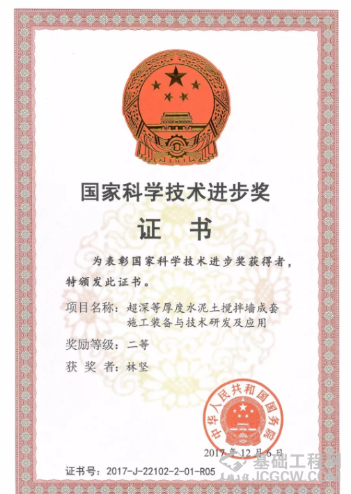 由华东建筑设计院、上海基础工程集团、上海金泰工程机械有限公司等七家单位共同完成的《超深等厚度水泥土搅拌墙成套施工装备与技术研发及应用》项目荣获2017年国家科技进步二等奖。