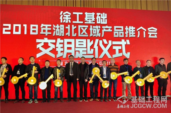 徐工基础副总经理张忠海与湖北徐基工程机械有限公司总经理刘海涛将象征财富的金钥匙交到了客户手中