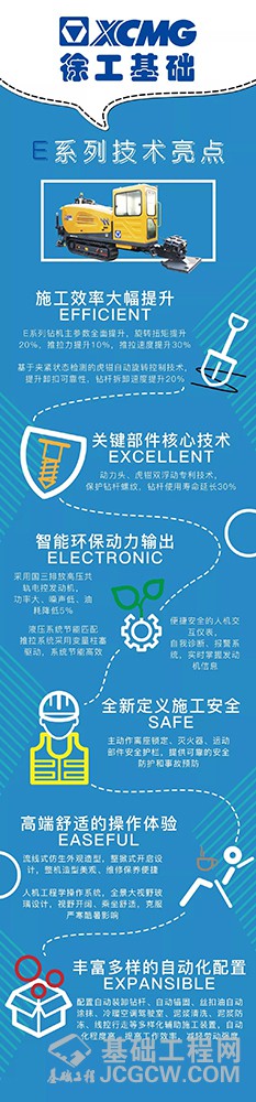 在4月11日召开的第22届中国国际非开挖展会上,徐工E系列产品将全新亮相。让我们先用一张图快速了解一下E系列产品的技术亮点吧。