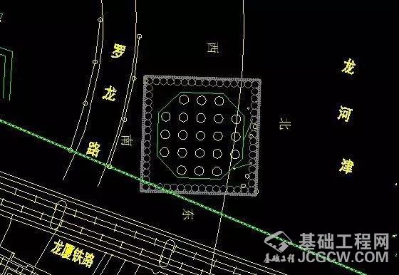 如图所示龙岩大道高架桥主塔桩基础平面尺寸24.2m×24.2m,呈八角形,共设计φ2.5m钻孔灌注桩21根,行列布置。承台北侧已部分侵入龙津河,东侧邻近龙厦高铁线,南侧侵占部分罗龙路,西侧紧挨商铺。施工空间极其狭小,还必须保证铁路安全(离铁路最近处仅15m),不能影响南侧道路的通行,还肩负龙津河的环保重任,也就是说除了主体结构空间之外,周围只有极少空间可用来施工。