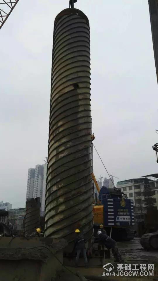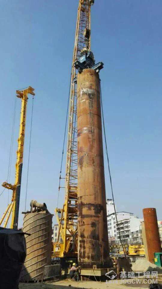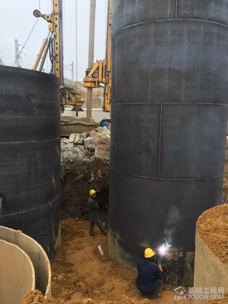 考虑到地下溶洞极其发育,我们采用全护筒跟进方式进行施工,护筒最多时候为6层,分别为(直径)3.6m,3.3m,3.05m,2.86m,2.65m,2.42m。