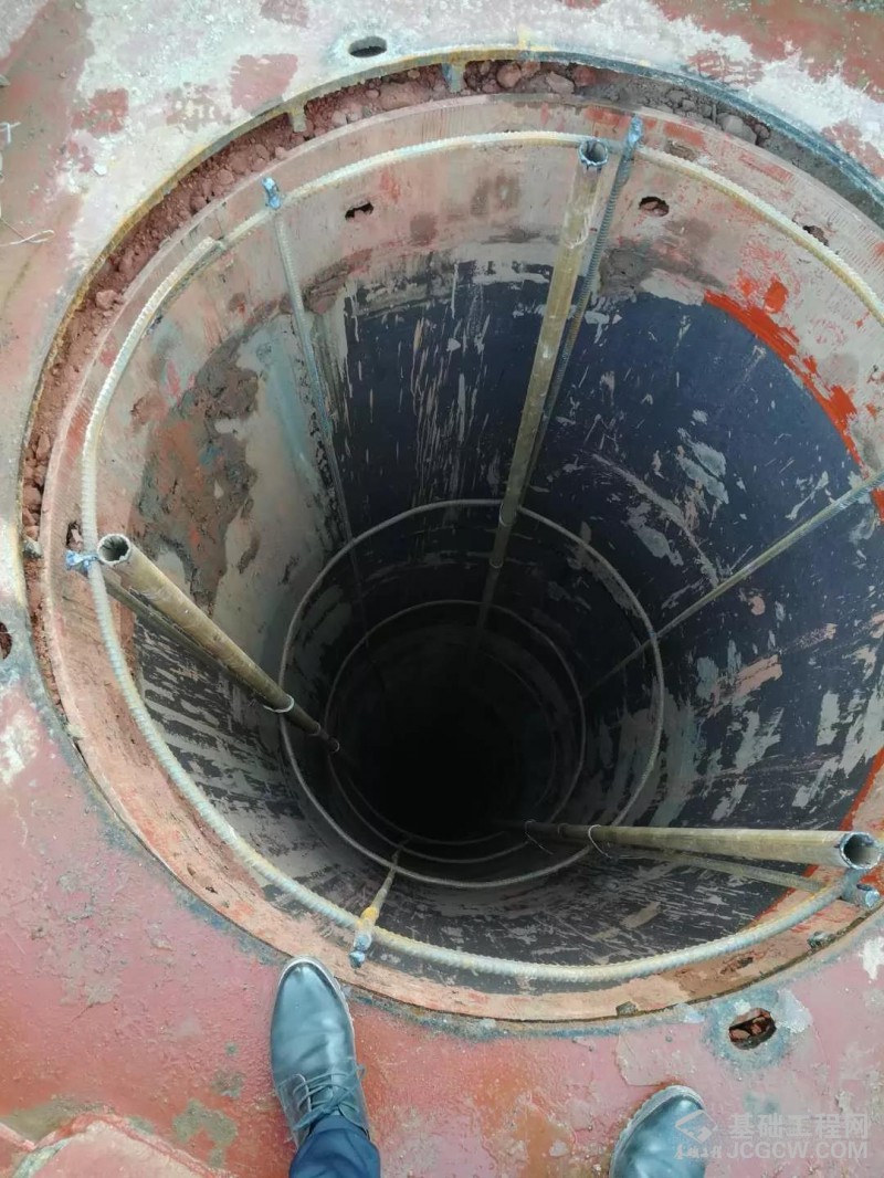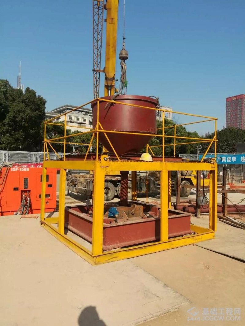 本项目桩径1.2m,桩深45m,钢立柱长约24m,笼长21m,施工场地狭小,位于城市闹区,施工难度大,经多次研讨,南京铁义华基础工程有限公司采用全回转钻机先钻孔,钻孔深度同钢立柱的长度基本一致,确保钢立柱插入段孔内的稳定及垂直度,套管下部桩基由旋挖钻机接力成孔,可最大限度发挥全回转钻机和旋挖钻机的特点,有效的解决现场施工的疑难问题及施工周期。