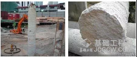 图为宝峨挤土桩工法应用在马来西亚吉隆坡基础桩工程项目上,开挖出来的桩基(左图)及桩底(右图)的情况。