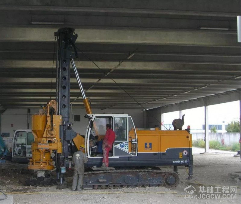 图为在净空高度仅有7米的空间,宝峨钻机施工完成510毫米直径一次性桩尖挤土桩,桩深18米,桩数量350根,18小时可完成12根桩。