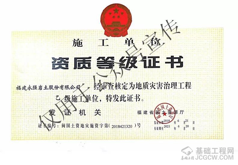 核心提示: 永强岩土于2018年6月21日获批地质灾害治理工程施工乙级资质。该资质的取得,提升了公司地质灾害治理工程施工资质等级,进一步